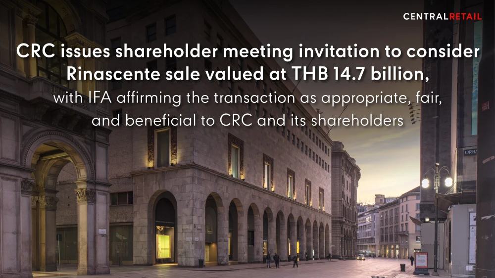 CRC issues shareholder meeting invitation to consider Rinascente sale valued at THB 14.7 billion, with IFA affirming the transaction as appropriate, fair, and beneficial to CRC and its shareholders