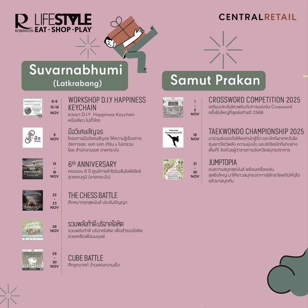 ศูนย์การค้าโรบินสันไลฟ์สไตล์ ในเครือเซ็นทรัล รีเทล เชิญชวนทุกคนร่วมสัมผัสช่วงเวลาแห่งการให้ ส่งต่อความสุขและโมเมนต์ดีๆ ปลายปี ผ่านหลากหลายกิจกรรมกว่า 100 อิเวนต์ทุกสาขาทั่วประเทศ ตลอดเดือนพฤศจิกายน 2568 อาทิ การบริจาคโลหิตเพื่อช่วยเหลือชีวิตเพื่อนมนุษย์ เทศกาลอาหารอร่อยจากทั่วไทย เวิร์กชอปสร้างสรรค์ กิจกรรมกับสัตว์เลี้ยงน่ารัก และเวทีแสดงความสามารถของเยาวชน ตอกย้ำพื้นที่แห่งการเป็นศูนย์กลางชีวิตของทุกคน หรือ Central to Life ที่มุ่งมอบประสบการณ์ที่อบอุ่นและประทับใจในกับทุกท่านในทุกครั้งที่มาใช้บริการ