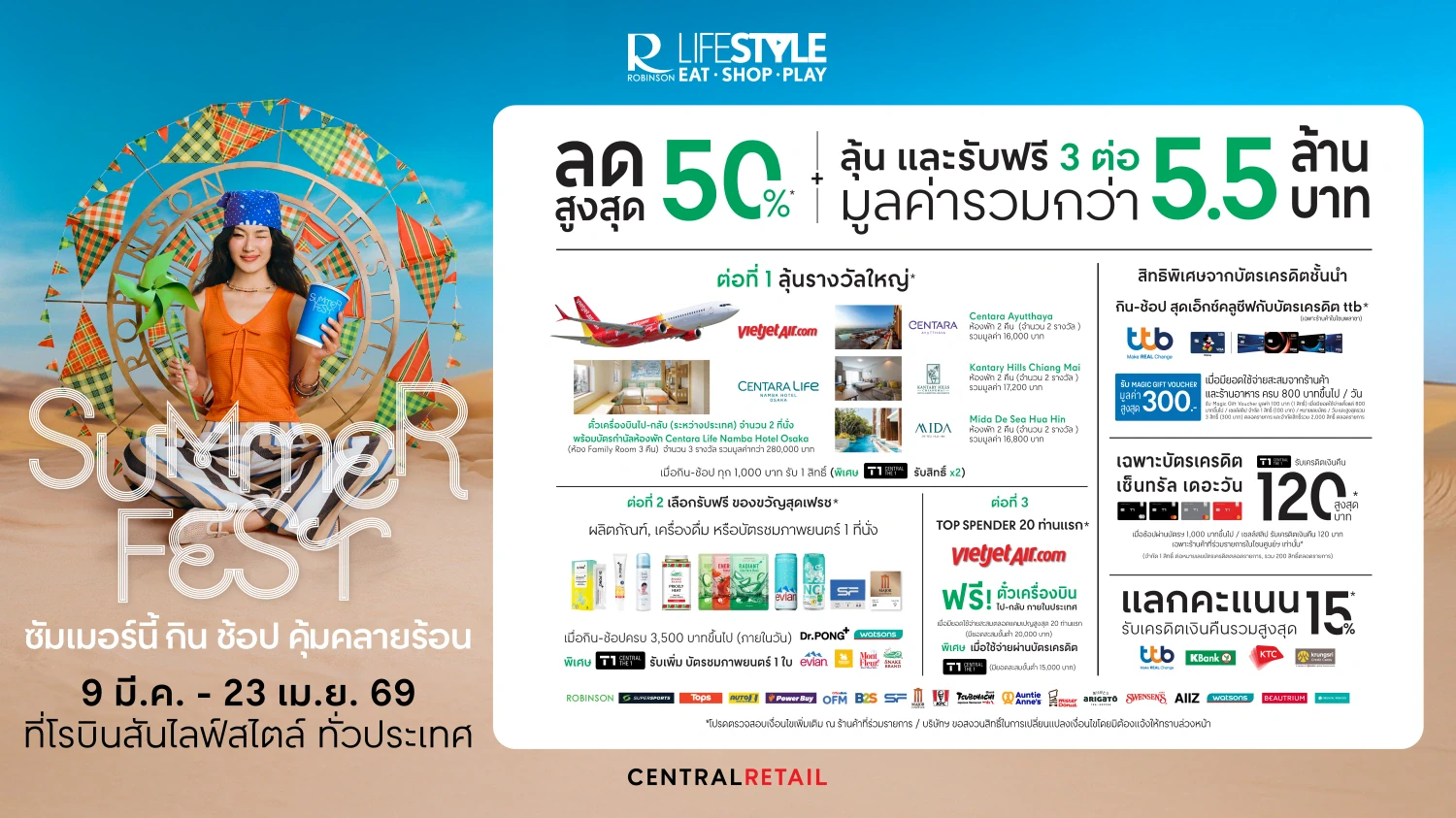 ศูนย์การค้าโรบินสันไลฟ์สไตล์ ในเครือเซ็นทรัล รีเทล เดินหน้าสร้างสีสันต้อนรับฤดูกาลท่องเที่ยวและเทศกาลสงกรานต์ เปิดตัวแคมเปญใหญ่แห่งปี “Robinson Lifestyle Summer Fest ซัมเมอร์นี้ กิน ช้อป คุ้ม คลายร้อน” ชวนลูกค้าทั่วประเทศออกมาสนุกกับประสบการณ์ซัมเมอร์ครบทุกไลฟ์สไตล์ ทั้งโปรโมชันสุดคุ้ม กิจกรรมความบันเทิงคลายร้อนสำหรับทุกวัย และแลนด์มาร์กซัมเมอร์สุดชิคที่พร้อมสร้างบรรยากาศสดใสทั่วศูนย์การค้าฯ ตั้งแต่วันที่ 9 มี.ค. 69 – 23 เม.ย. 69 ณ ศูนย์การค้าโรบินสันไลฟ์สไตล์ทั่วประเทศ โดยมุ่งกระตุ้นการจับจ่ายและสร้างสีสันความสุขแห่งการใช้เวลาร่วมกันของทุกคนในครอบครัวช่วงซัมเมอร์นี้