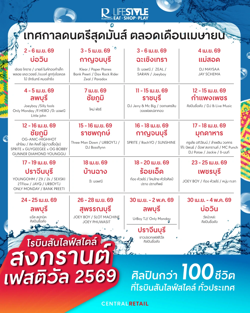 ต้อนรับเทศกาลสงกรานต์ด้วยงาน “Summer Fest - Songkran Festival 2569” เทศกาลดนตรีและความบันเทิงครั้งใหญ่ทั่วไทย ที่เตรียมยกทัพศิลปินกว่า 100 ชีวิต มาร่วมสร้างสีสันและความสนุกตลอดเดือนเมษายน 2569 ณ โรบินสันไลฟ์สไตล์ ทั่วประเทศ เพื่อร่วมเฉลิมฉลองเทศกาลปีใหม่ไทยซึ่งเป็นช่วงเวลาแห่งความสุขของครอบครัว การกลับมาพบปะกันของคนใกล้ชิด และโมเมนต์แห่งความประทับใจที่มีความหมาย โดยโรบินสันไลฟ์สไตล์ยังคงตอกย้ำบทบาทในฐานะ “Central to Life” ศูนย์กลางชีวิตของทุกคน ผ่านการคัดสรรอิเวนต์ที่ตอบโจทย์ไลฟ์สไตล์อันหลากหลายของคนทุกเจเนเรชัน ทั้งสายดนตรี สายบันเทิง สายกิน และสายช้อป รวมไปถึงกลุ่มครอบครัวที่มองหาพื้นที่สำหรับพักผ่อนและใช้เวลาร่วมกันได้อย่างลงตัว พร้อมเนรมิตแต่ละสาขาให้กลายเป็นจุดหมายแห่งการเฉลิมฉลองที่เต็มไปด้วยบรรยากาศแห่งความสุข ความคึกคัก และประสบการณ์ความบันเทิงที่หลากหลาย ครอบคลุมทั้งแนวป๊อป ร็อก ฮิปฮอป ลูกทุ่ง ดีเจ และการแสดงสดอีกมากมาย ชวนทุกคนให้ออกมาร่วมสนุกและสัมผัสสีสันของสงกรานต์อย่างเต็มอิ่มตลอดทั้งเดือน