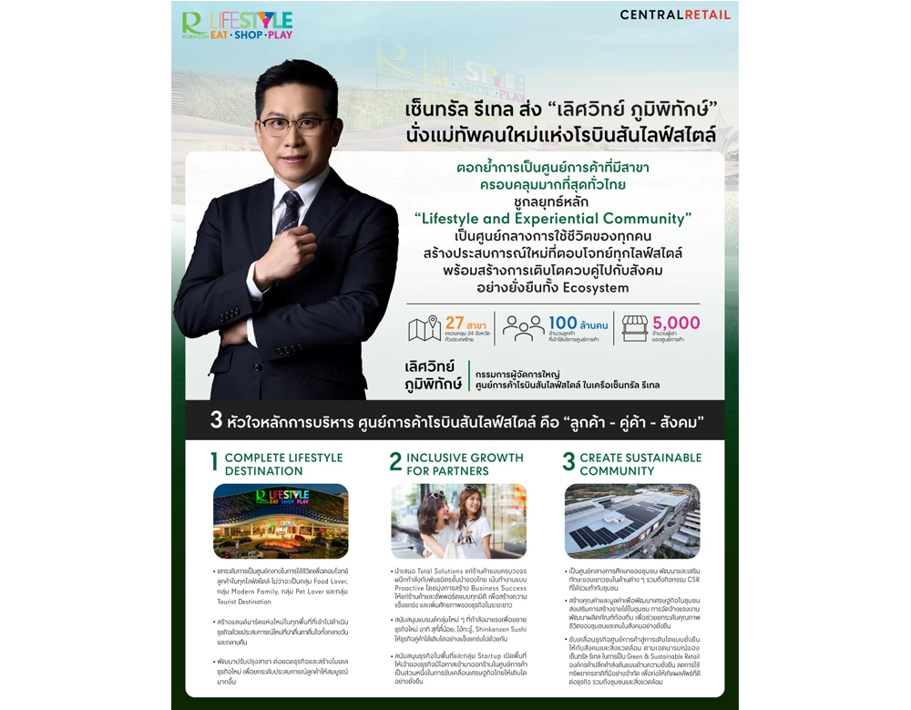 เซ็นทรัล รีเทล ประกาศแต่งตั้ง “เลิศวิทย์ ภูมิพิทักษ์” ขึ้นรับตำแหน่ง กรรมการผู้จัดการใหญ่ ศูนย์การค้าโรบินสันไลฟ์สไตล์ ในเครือเซ็นทรัล รีเทล เดินหน้าต่อด้วยกลยุทธ์หลัก “Lifestyle and Experiential Community” เป็นศูนย์กลางการใช้ชีวิตของทุกคนในแต่ละพื้นที่ทั่วไทย พร้อมเสริมแกร่งการเป็นศูนย์รวมทุกความต้องการของลูกค้าแบบครบวงจร ทั้งห้างสรรพสินค้า ร้านสเปเชียลตี้สโตร์ ร้านอาหาร โรงภาพยนตร์ บริการและสิ่งอำนวยความสะดวกต่างๆ อีกมากมายรวมกว่า 1,000 แบรนด์ชั้นนำทั้งไทยและระดับโลก เพื่อตอกย้ำการเป็นศูนย์การค้าที่มีสาขาครอบคลุมมากที่สุดทั่วประเทศไทย สร้างประสบการณ์ใหม่ที่ตอบโจทย์ทุกไลฟ์สไตล์แบบครบจบในที่เดียว พร้อมยกระดับเศรษฐกิจไทยและเติบโตควบคู่ไปด้วยกันอย่างยั่งยืน