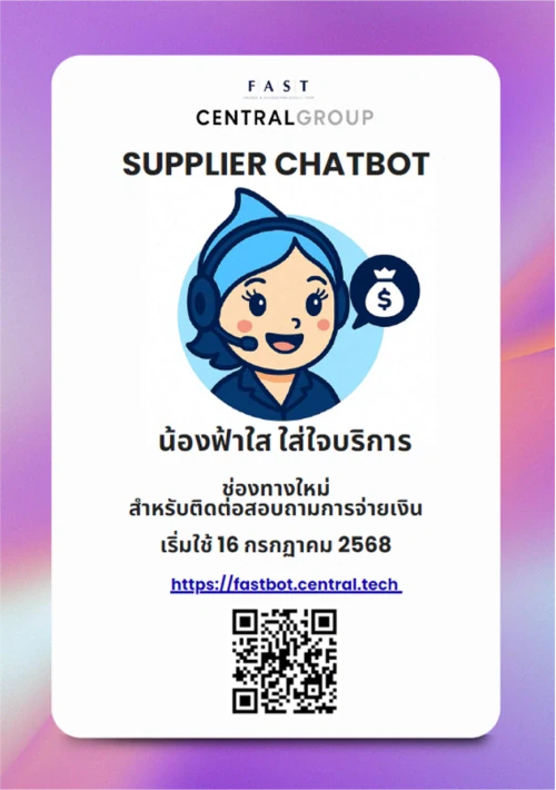 เซ็นทรัล รีเทล มุ่งยกระดับการบริหารจัดการห่วงโซ่อุปทานอย่างมีประสิทธิภาพ โปร่งใส และยั่งยืน ผ่านโครงการ FAST Supplier Chatbot ‘น้องฟ้าใส’ ผู้ช่วยสำหรับซัพพลายเออร์และคู่ค้า ที่ออกแบบมาเพื่อช่วยให้ข้อมูลและตอบคำถามที่เกี่ยวข้องกับการชำระเงินให้กับคู่ค้าได้อย่างทันท่วงที รองรับคู่ค้ามากกว่า 10,000 ราย ถูกใช้งานเฉลี่ยประมาณ 800 ครั้งต่อเดือน และลดระยะเวลาการตอบกลับจากประมาณ 1 วัน เหลือเพียง 1 นาที ช่วยแก้ปัญหาความล่าช้าในการติดตามยอดชำระ และลดภาระงานของทีมปฏิบัติการที่ต้องตอบคำถามซ้ำ ๆ ตลอดทั้งวัน ด้วยการเป็นบริการแบบ Self-service ที่ให้บริการตลอด24 ชั่วโมงทุกวัน คู่ค้าสามารถตรวจสอบข้อมูลได้ทุกที่ทุกเวลา โดยไม่จำเป็นต้องเดินทาง ติดต่อ Call Center หรือแลกเปลี่ยนเอกสารซ้ำซ้อน ส่งผลให้เกิดการลดการใช้ทรัพยากรในหลายมิติ